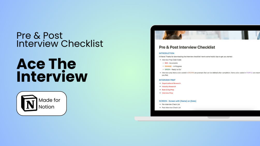Check out my new pre- and post-interview checklist template on Notion. This template is a labor of love that I created for my own job search journey, so you know its been put through its paces and streamlined!