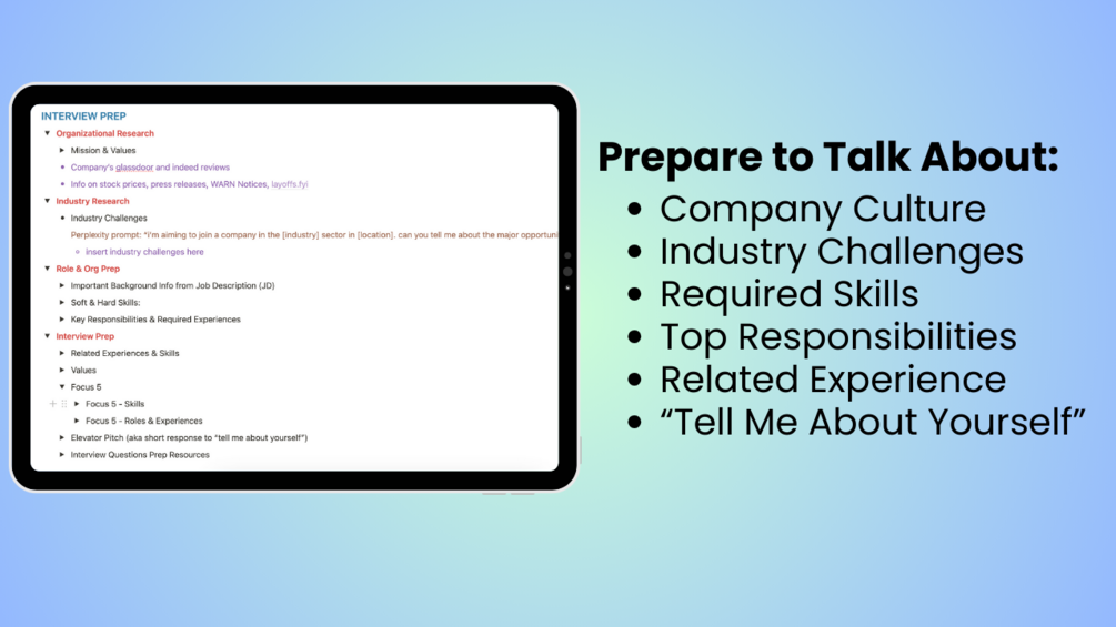 Full of color coded tasks to complete and prompts to utilize AI in your interview prep, this template is your ultimate companion for acing every stage of the interview process. From deep company research to crafting the perfect answer to the dreaded "Tell me about yourself" question, this checklist has everything you need to shine.